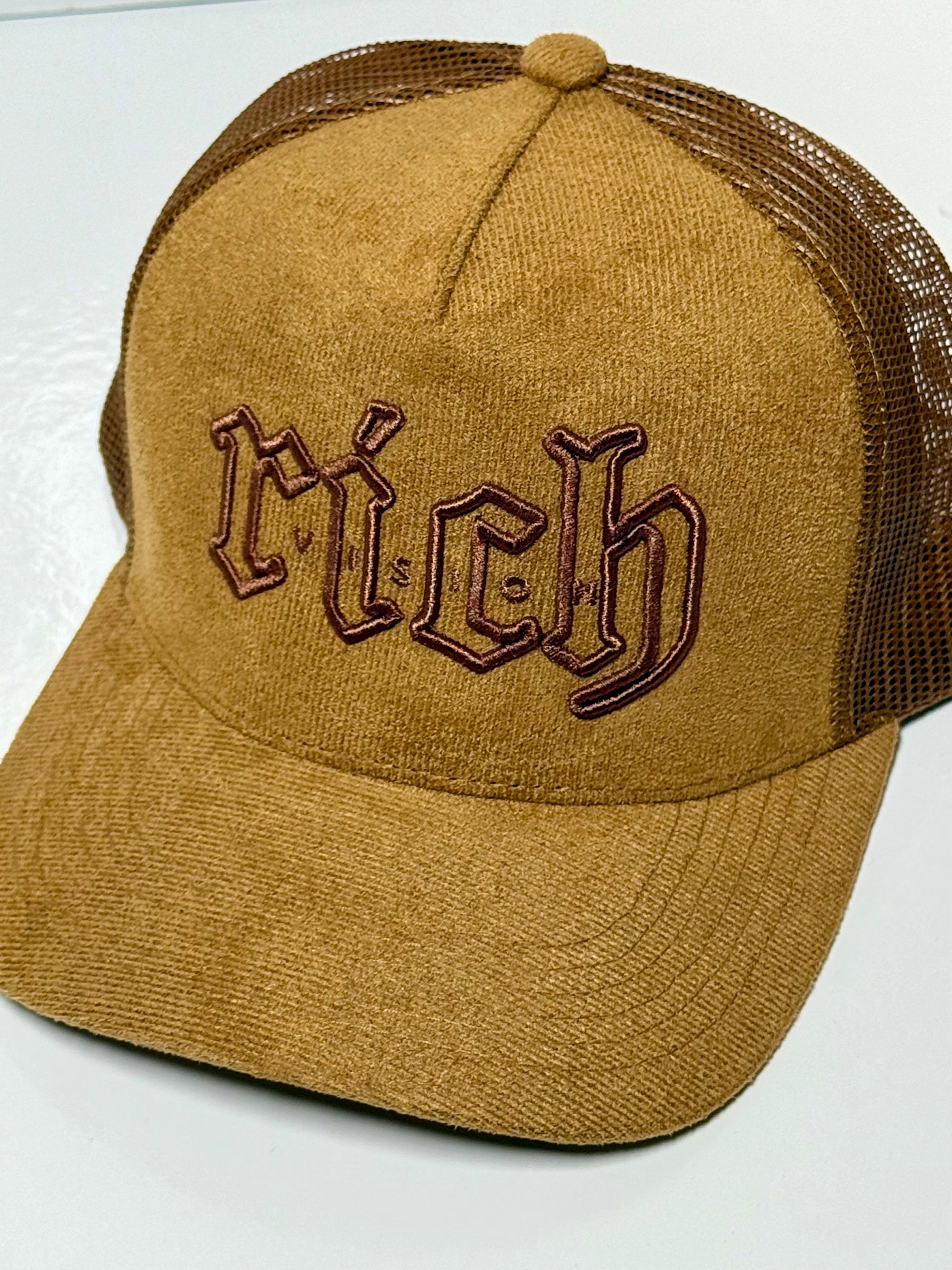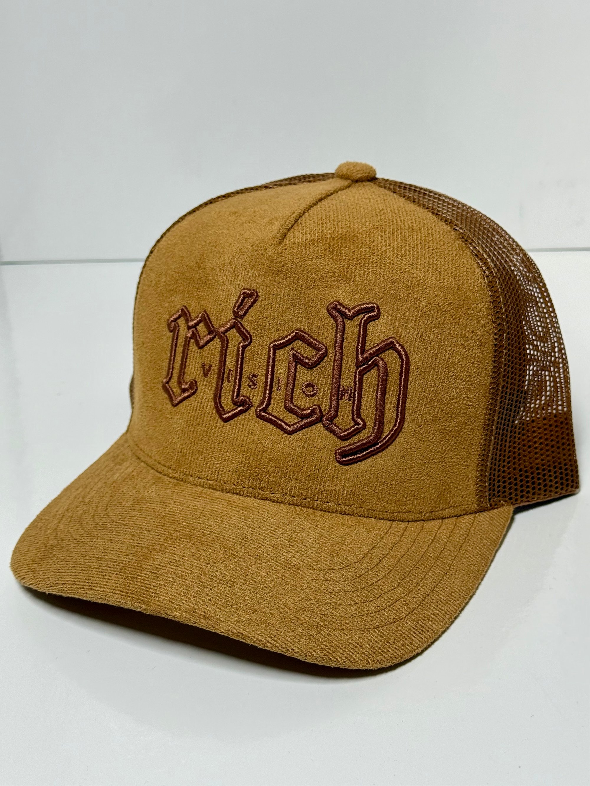 Built with premium materials, this hat features a suede wheat front panel with breathable mesh back and our signature Rich Vision logo embroidered on the front panel. OS [One-size-fits-all.]